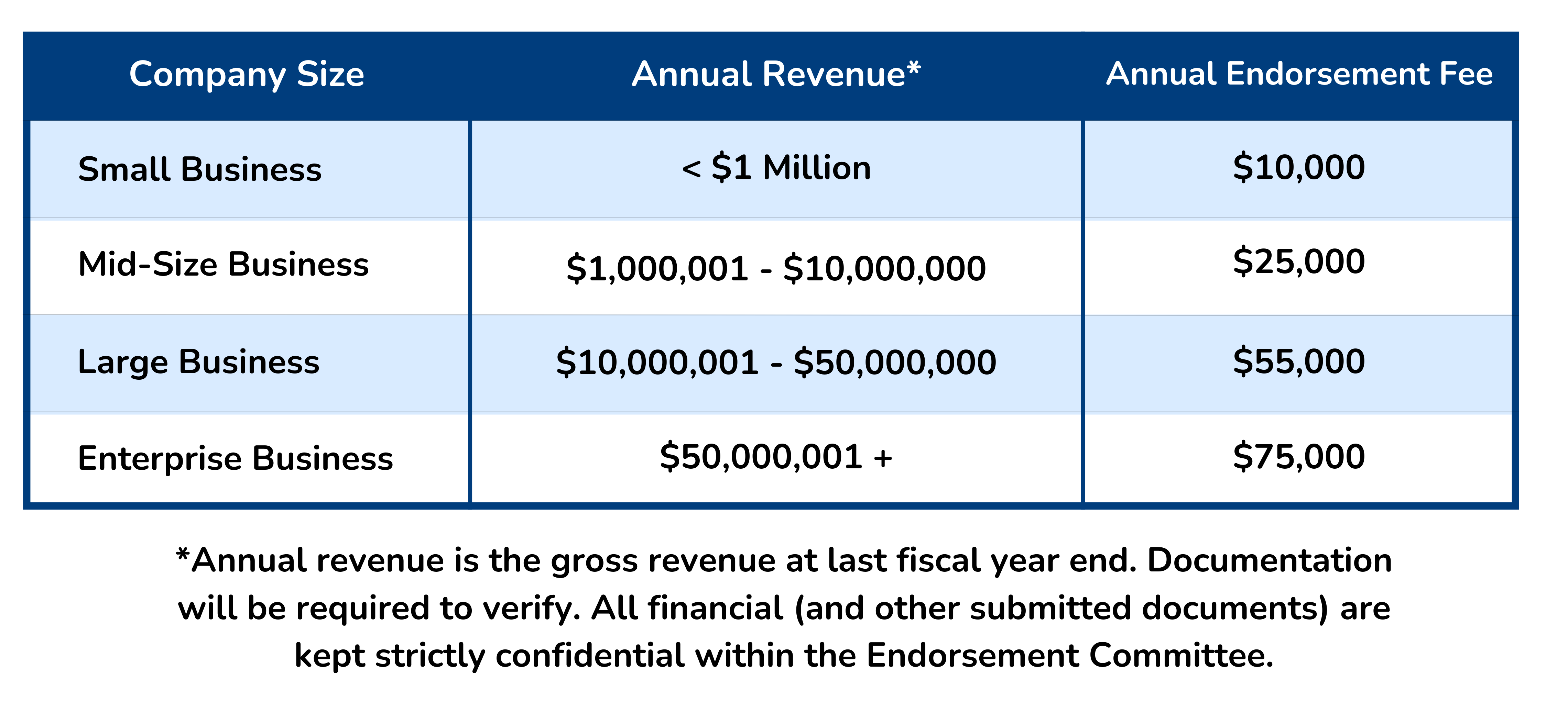 - Endorsement Fee: Each endorsement lasts a period of 3 years. You will be invoiced each year of the endorsement. The first year of payment is due at the time of endorsement. Your endorsement fee is based on your company’s revenue. This ensures an endorsement is accessible for companies of all sizes. Please see pricing chart below.