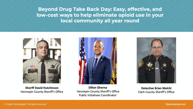 With opioid use and abuse on the exponential rise, law enforcement agencies are realizing the need for ongoing efforts to battle these problems. In this webinar, you’ll get real-world insight from Minnesota’s Hennepin County Sheriff Dave Hutchinson and Detective Brian Melchi of Ohio’s Clark County Sheriff’s Office about effective, low-cost ways to help eliminate opioid misuse all year long. Hear expert perspective on impactful solutions including prevention and recovery support options, community outreach programs, and at-home drug deactivation and disposal.