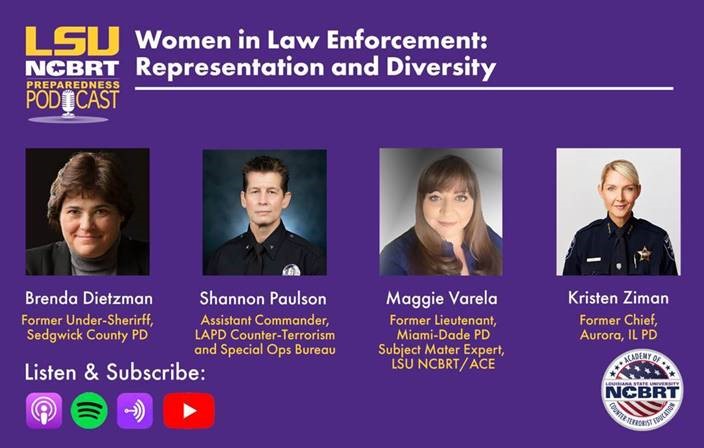 Today is episode two of our five-episode series on women in law enforcement. Guests include Brenda Dietzman, former colonel and under-sheriff for the Sedgwick County Sheriff’s Office in Wichita, KS; Shannon Paulson, assistant commanding officer of the LAPD’s Counter-Terrorism and Special Operations bureau; Maggie Varela, former Miami-Dade PD lieutenant; and Kristen Ziman, former chief of the Aurora, IL PD. In today’s episode, they discuss representation of women in law enforcement, the importance of seeing women in leadership positions, and the specific skills women bring to law enforcement.